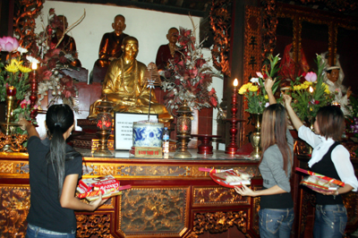 Những bông hồng tươi thắm được bạn trẻ này chuẩn bị đặt trên ban thờ gian Chính điện chùa Trấn Quốc.