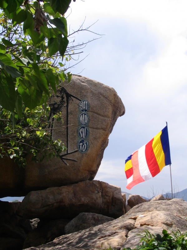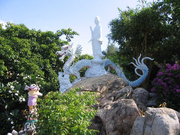 Bên dưới nền Quan Âm Các là một bãi đá trải dài ra đến biển với tượng Bồ Tát Quan Thế Âm mặt hướng ra biển.