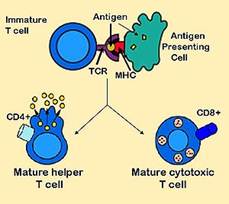 Function of T helper cells: Antigen presenting cells (APCs) present antigen on their Class II MHC molecules (MHC2). Helper T cells recognize these, with the help of their expression of CD4 co-receptor (CD4+). The activation of a resting helper T cell causes it to release cytokines and other stimulatory signals (green arrows) that stimulate the activity of macrophages, killer T cells and B cells, the latter producing antibodies.