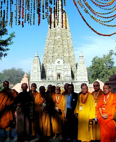 | Đoàn cung nghinh xá lợi Phật lễ dưới chân gốc cây bồ đề tại Bồ Đề Đạo tràng ở Ấn Độ. |